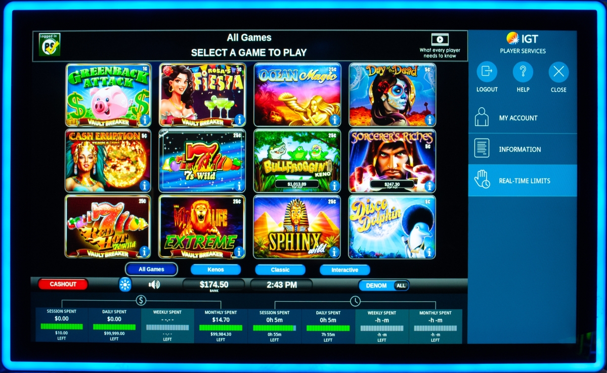 The Player Services Account is a responsible gaming tool. The account allows users to set time/ spend limits, review their time/ spend history and learn how VLTs work. Registration is voluntary and anonymous. The red ‘X’ closes the Player Services Window and the ‘PS Login’ button reopens it.